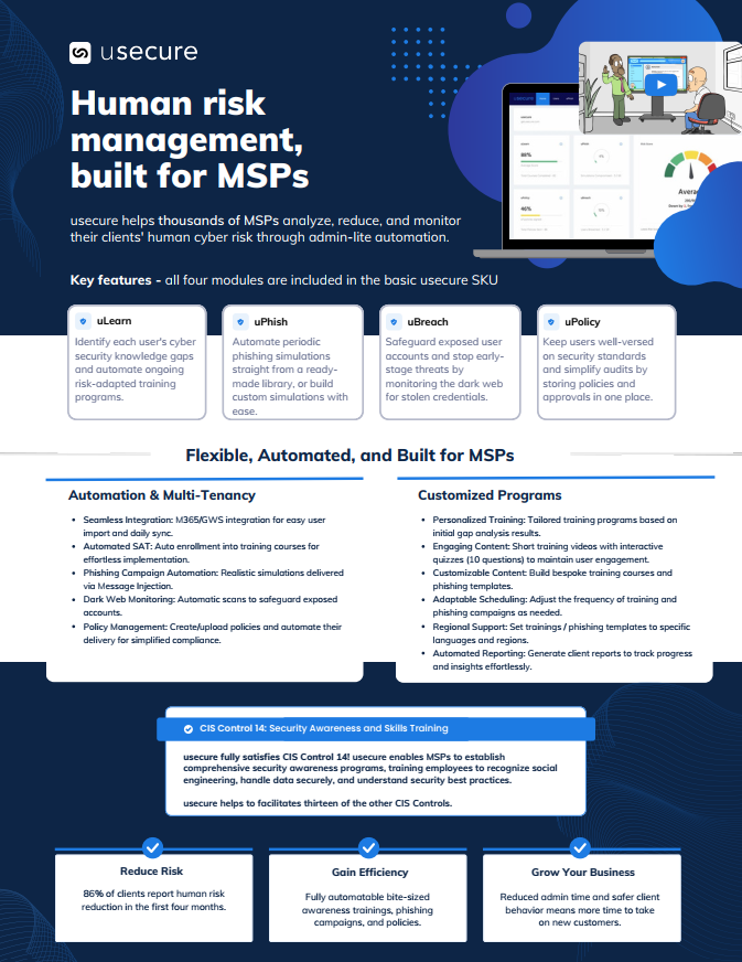 usecure helps MSPs address the human layer of cybersecurity. By combining awareness training, phishing simulations, dark web monitoring and policy management, usecure enables partners to reduce risk, change behaviour and prove security outcomes — all from a single MSP-first platform.